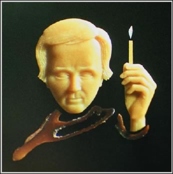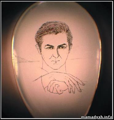 | Автопортрет Портрет (2,5х3 мм) выгравирован алмазным резцом на капле стекла. Работа Николая Сядристого (увеличено)
