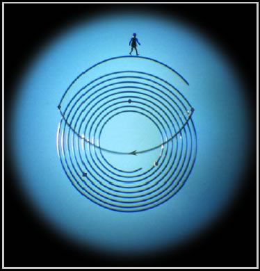 | По анкерному волоску, взятому из миниатюрных ручних часов, проходя важные и переломные моменты своей жизни, идет человек. Толщина фигурки, выполненной из золота, 5 микрон. Работа Николая Сядристого (увеличено)