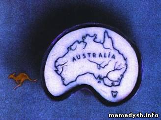 | Карта Австралии. Выгравирована на стекле, которое вставлено в половинку макового зёрнышка. Кенгуру изготовлено из золота. Работа Николая Сядристого (увеличено)