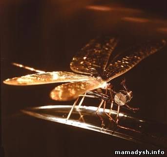 | Самые маленькие в мире действующие электрические часы, которые размещены в головке золотой стрекозы. Мотор и часы состоят из 130 деталей. Материал: золото, стекло. Работа Николая Сядристого (увеличено)